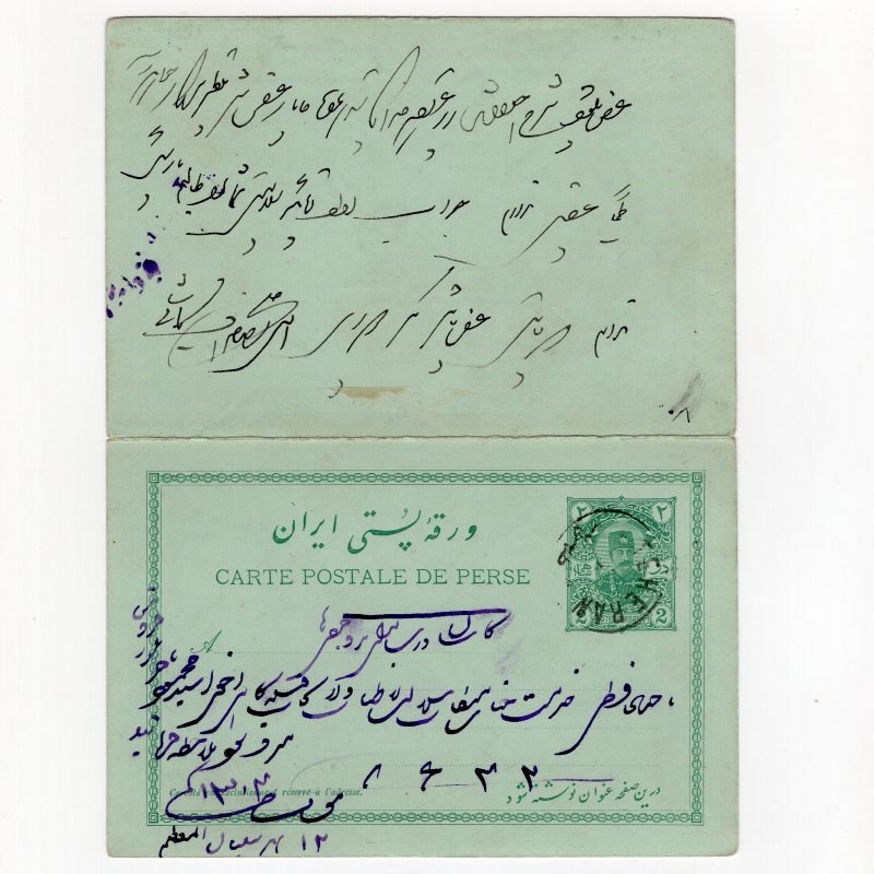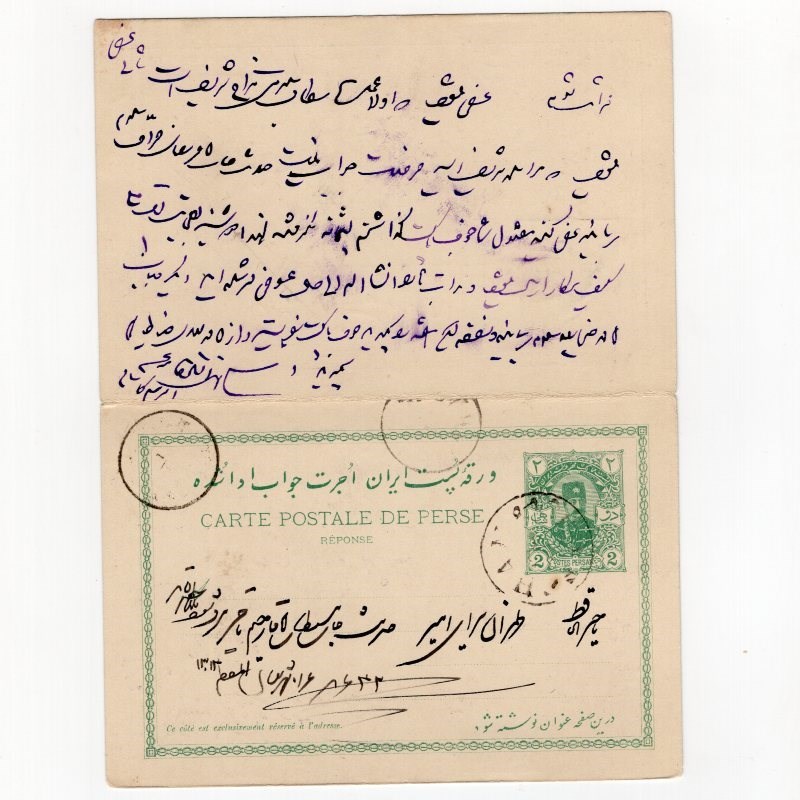 Intact 2ch+2ch green paid reply postal card Persiphila # PC13 hard to find intact mailed from Tehran to Kachan and response part from Kachan to Tehran, Persi value at Rare.