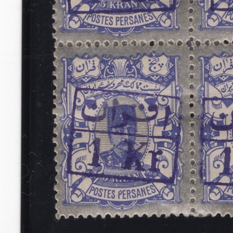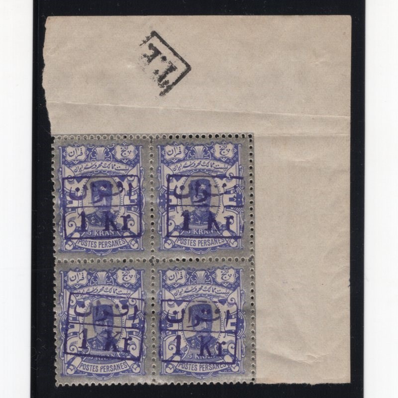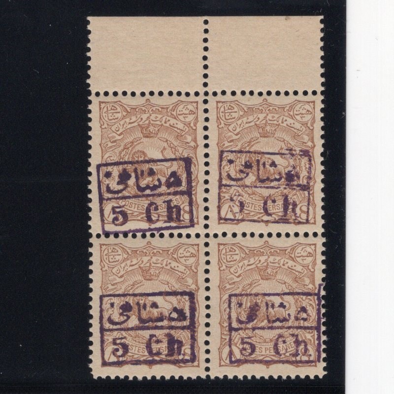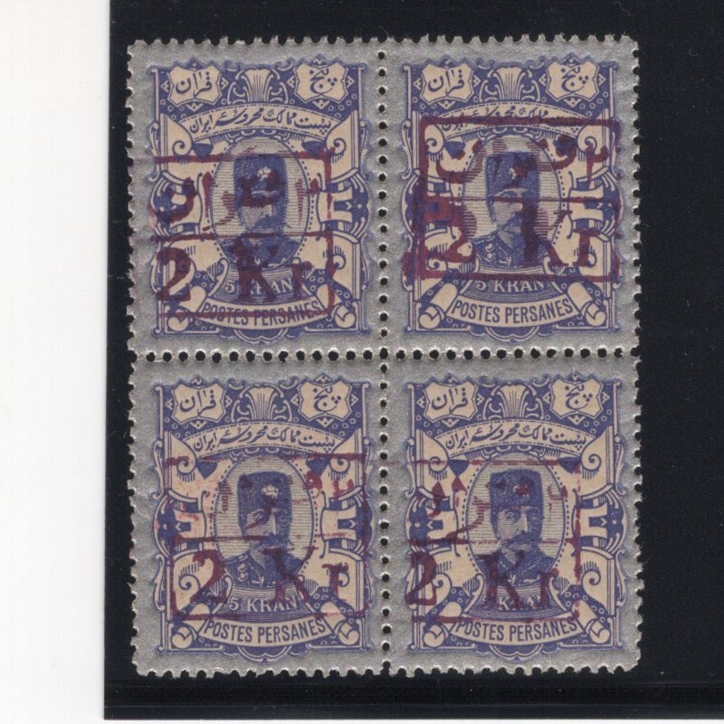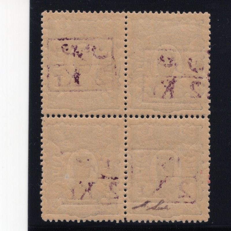 Three surcharge blocks of four Scott # 101-3 mint never hinged Scott value for four single hinged $520.00, Signed by Mr. Mehrdad Sadri.