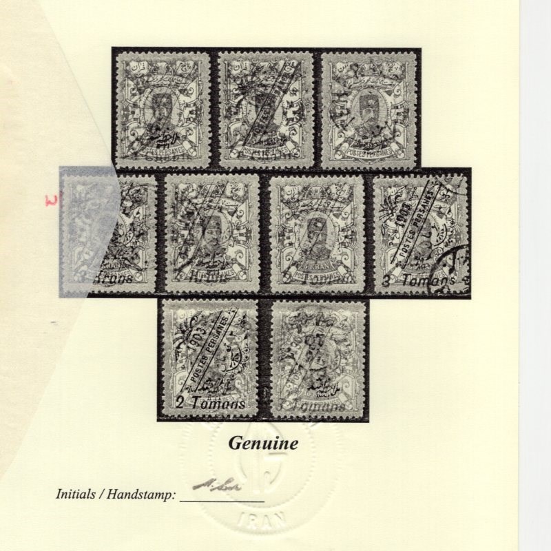 Complete set 9 Satdjian fancy surcharge on 5kr and 10kr Persiphila # 342-350 cancelled by favor due to demand for used stamps some with original gum Persi value for CTO set $435.00, certification by Mr. Mehrdad Sadri.