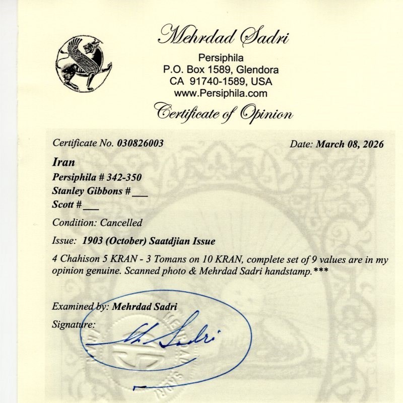 Iran 1903 Persi # 342-350 Used Set PV $435 Certified