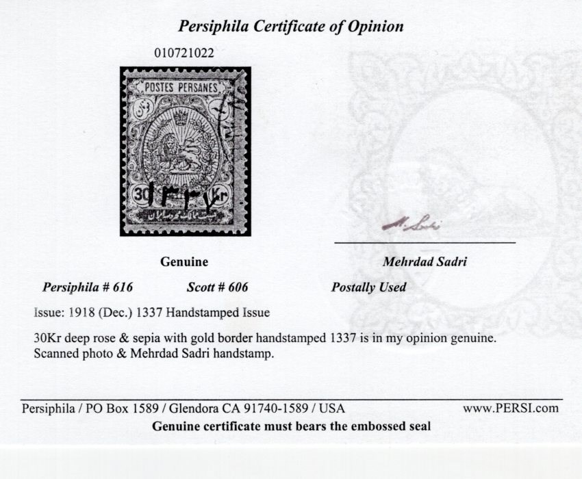 30kr coat of arms overprinted 1337 Scott # 606 postally used Scott value $200.00, Card certification by Mr. Mehrdad Sadri.