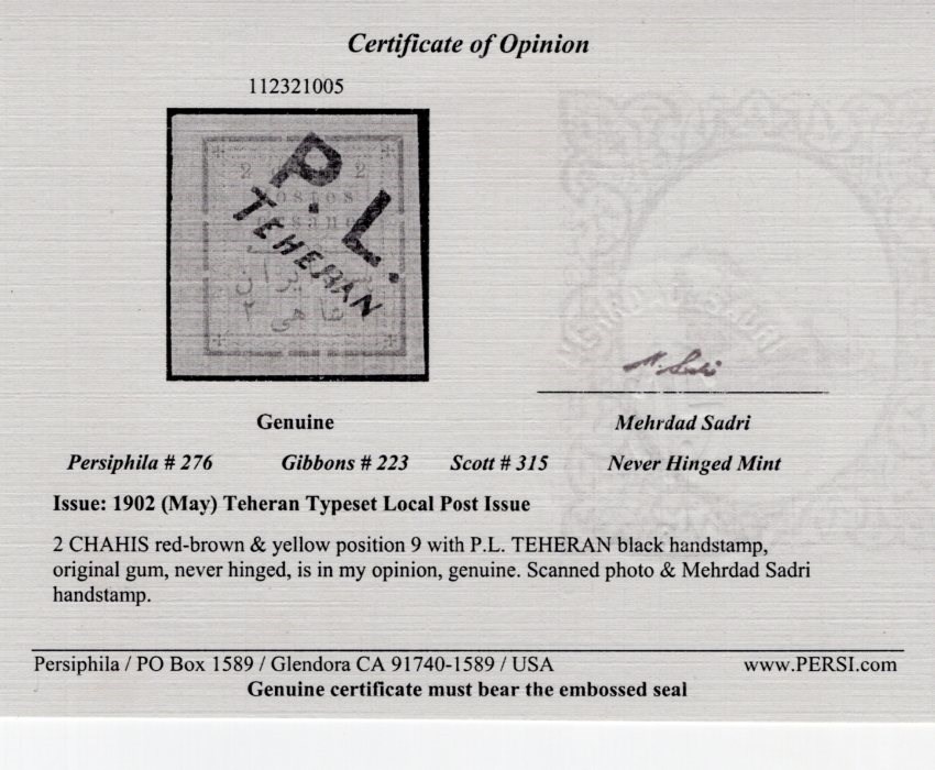 2ch typeset position 9 overprinted P.L. Tehran Scott # 315 mint never hinged Scott value for hinged $250.00, Card certification by Mr. Mehrdad Sadri.
