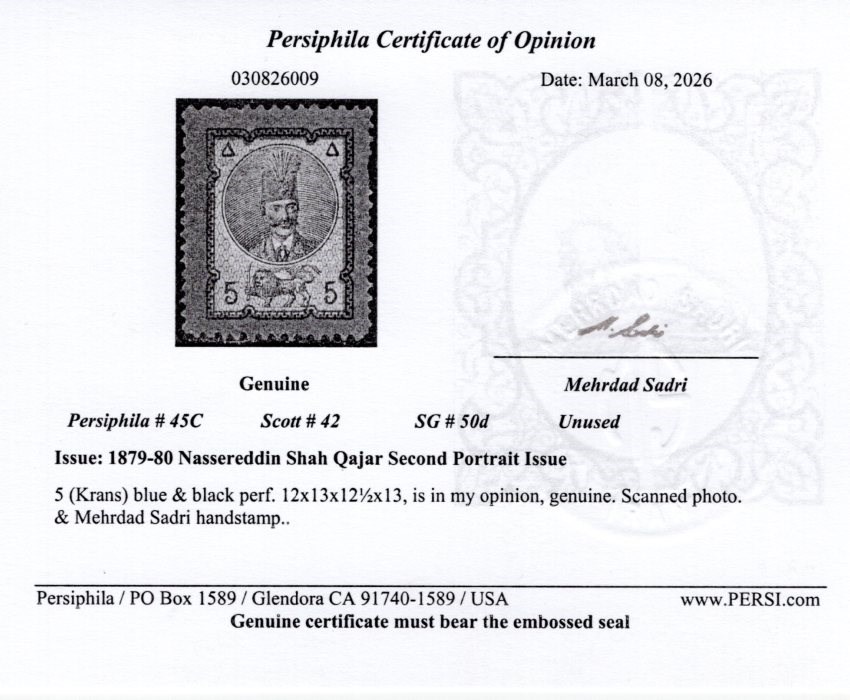 5kr blue & black Perf 12x13x12.5x13 Nasser-ed Din Shah 2nd portrait Scott # 42 Persiphila # 45C mint no gum some short perf Scott value $400.00, Card certification by Mr. Mehrdad Sadri.