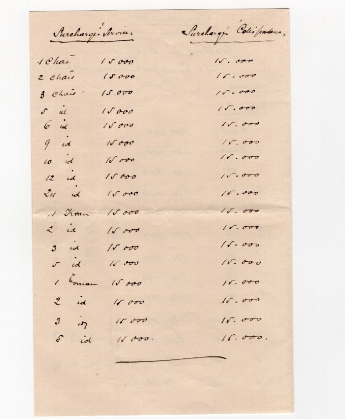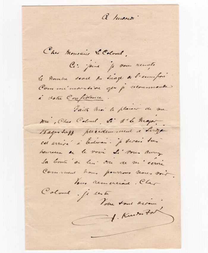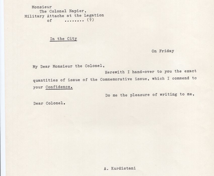 Confidential letter from Assadollah Kurdistani Minister of post in Tehran to Colonel Napier British legation military in Tehran giving details in confidence of quantities printed of various Issue.