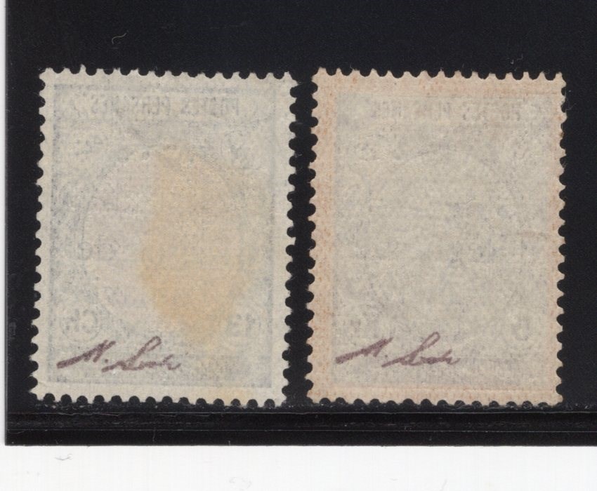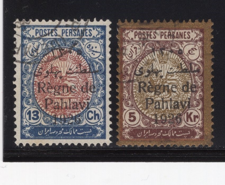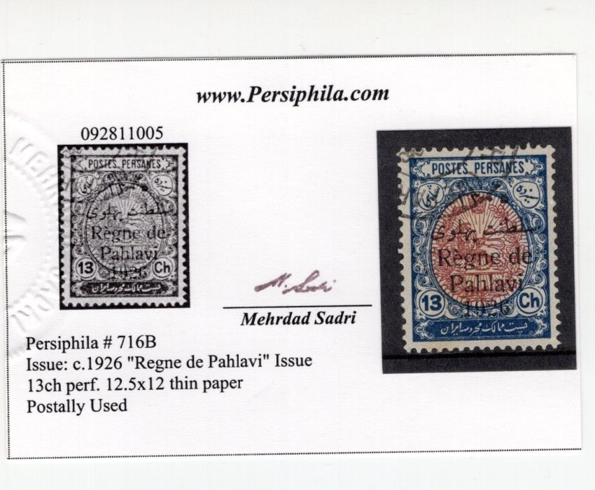 13ch and 5kr Pahlavi variety on thin paper Pers 12.5x12 Persiphila #716B, 722B postally used Persi value $250.00, 5kr signed and 13ch with mini certified by Mr. Mehrdad Sadri.