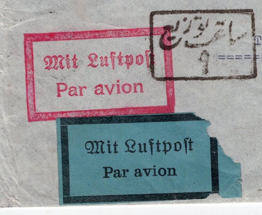 Perfin stamps single and pair on an airmail cover with corner fold from Durlach to Tehran via Berlin and Bender Pahlavi with boxed delivery time # 9.