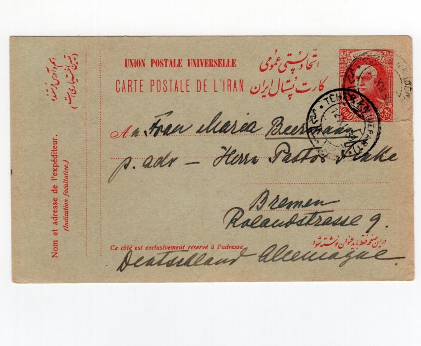 90 Dinar French text postal card Persiphila # PC58 mailed from Tehran to Bremen with crease on the side Persi value from $900.00