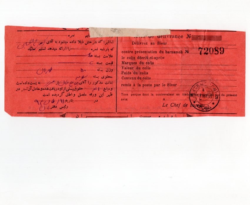 Single franking of 2kr Ahmad Shah coronation overprinted Colis Postaux Scott # Q29 on parcel delivery permit from Tauris to Tehran.