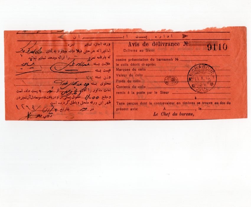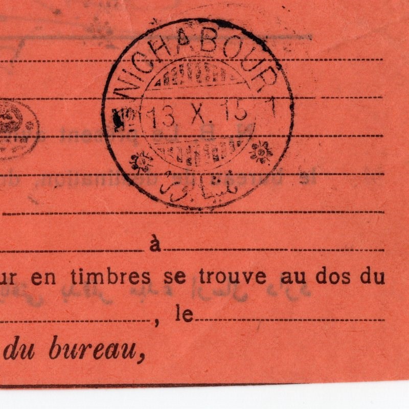 Pair of 2kr Ahmad Shah coronation overprinted Colis Postaux Scott # Q29 on parcel delivery permit from Meched # 3 to Nichabour.