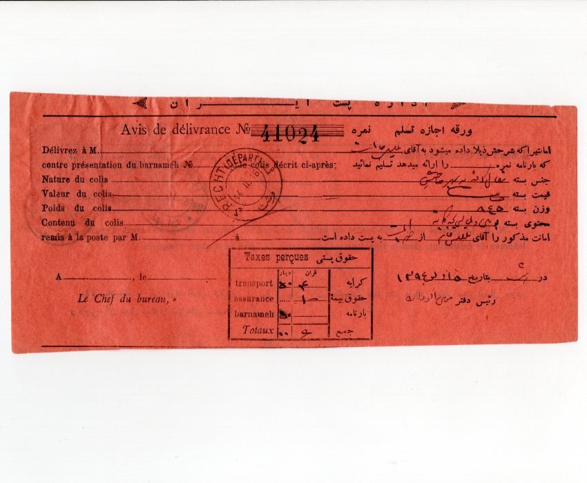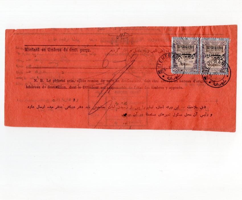 Pair of 3kr Ahmad Shah coronation overprinted Colis Postaux Scott # Q30 on parcel delivery permit from Tehran to Recht.