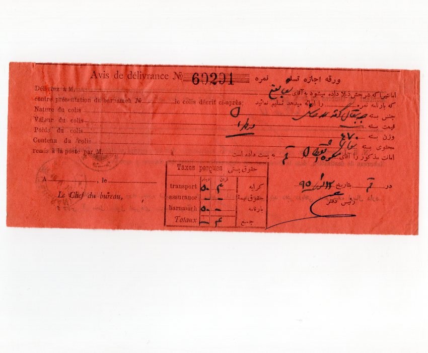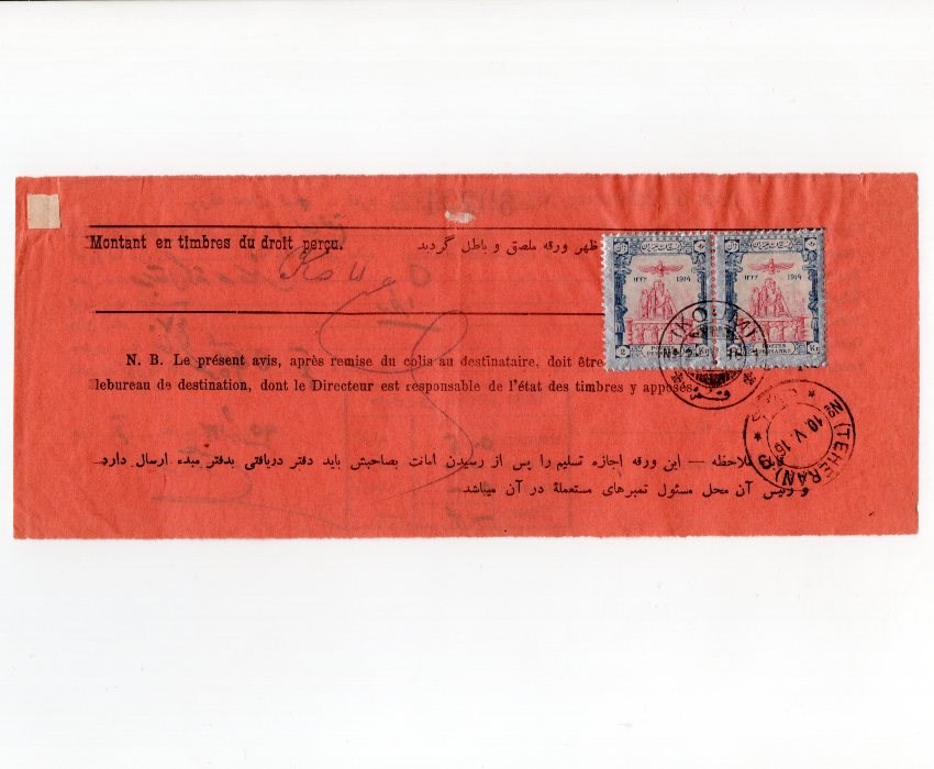 Pair of 2kr Ahmad Shah coronation Scott # 571 on parcel delivery permit from Koum to Tehran.