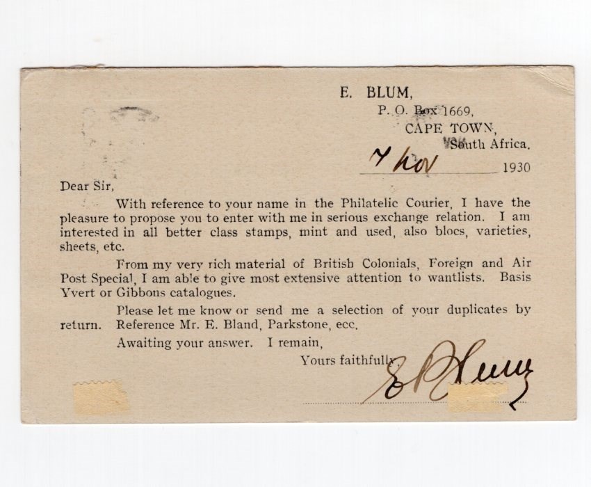 Postal card from Cape Town to Tehran with hinged remnant on the back.