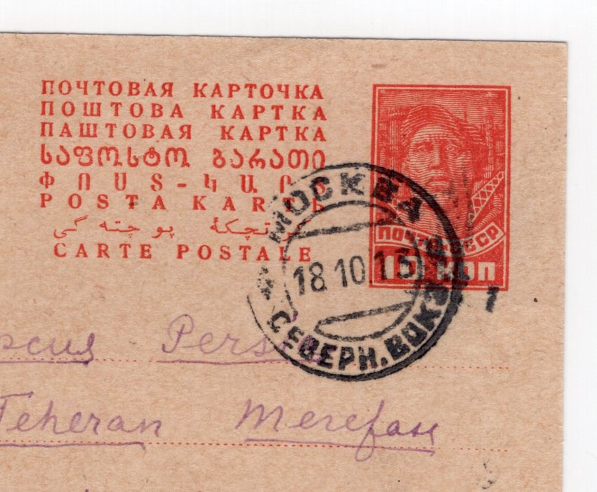 Cachet postal card with hinged remnant on the back from Moscow to Tehran.
