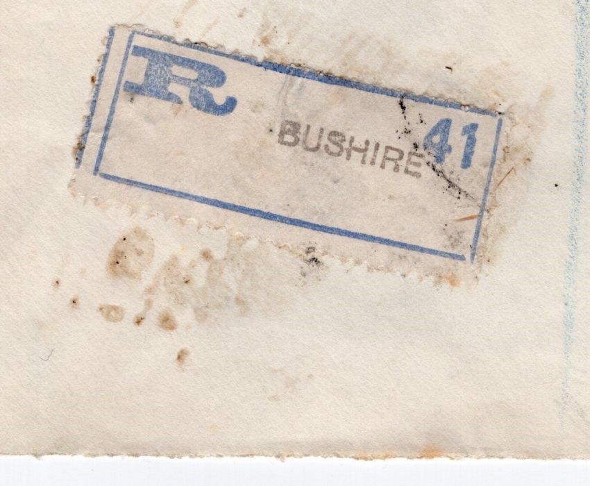 Late usage of Indian stamps in Bushire on a registered cover to London, cover opened from the top with Bushire registration label.