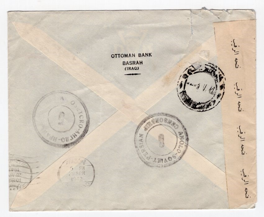 Ottoman bank cover with fold and tear on the back from Basra to Tehran via Baghdad with two different Anglo-Soviet-Persian censor and Iraqi censor with Arabic censor sealing label.