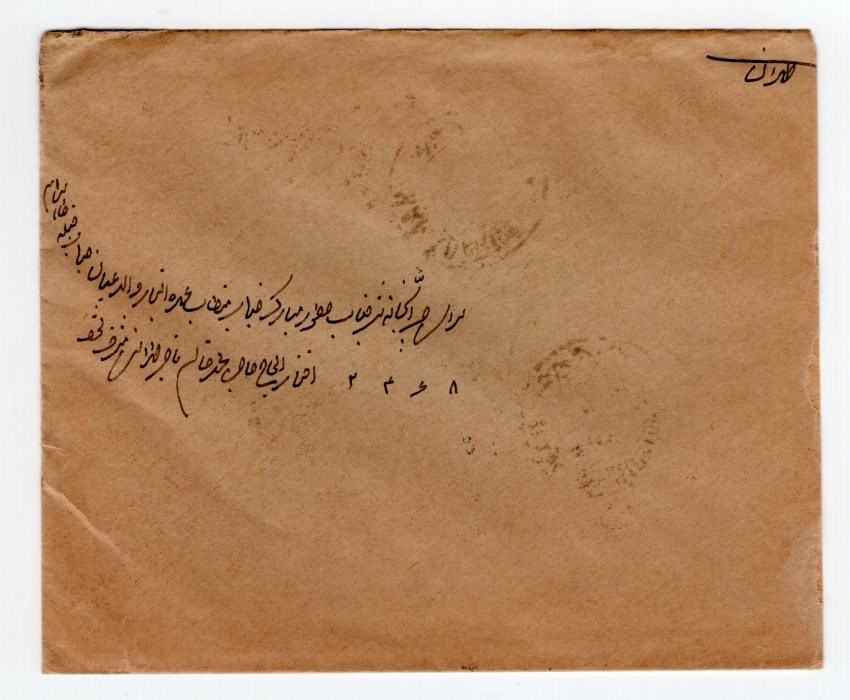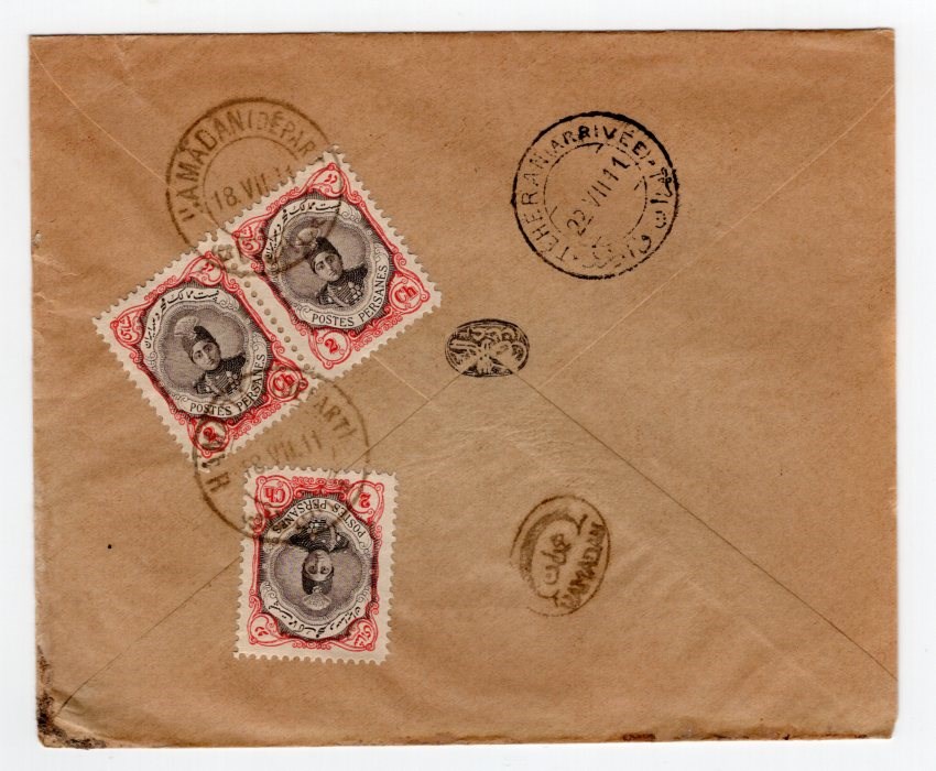 Single and pair 2ch short Ahmad Shah Scott # 482 used in July 1911 on cover from Hamadan to Tehran with an early black censor " C Hamadan ".