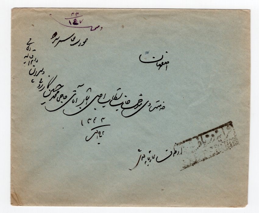 A prepaid cover with age discoloring from Tehran Bazar to Isfahan with boxed Keray Daryaft Shod Taxe Perque.