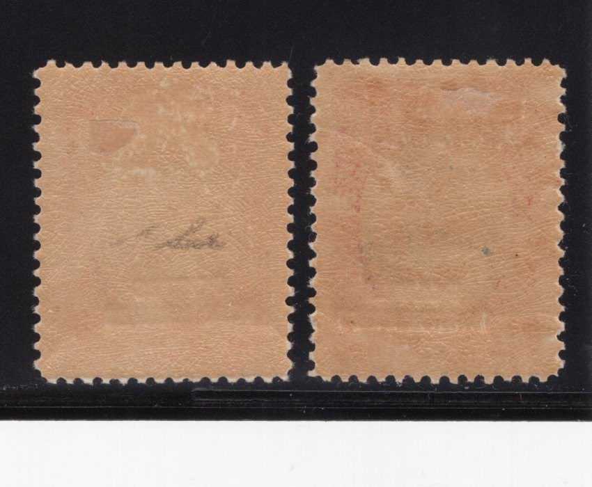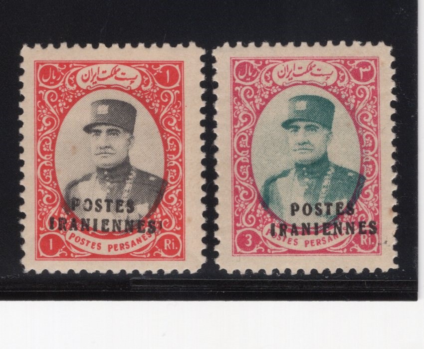 1r and 3 Rials Reza Shah overprinted Postes Iraninnes Scott # 804, 808 mint small hinged remnant Scott value $250.00, 1 Rials Signed by Mr. Mehrdad Sadri.