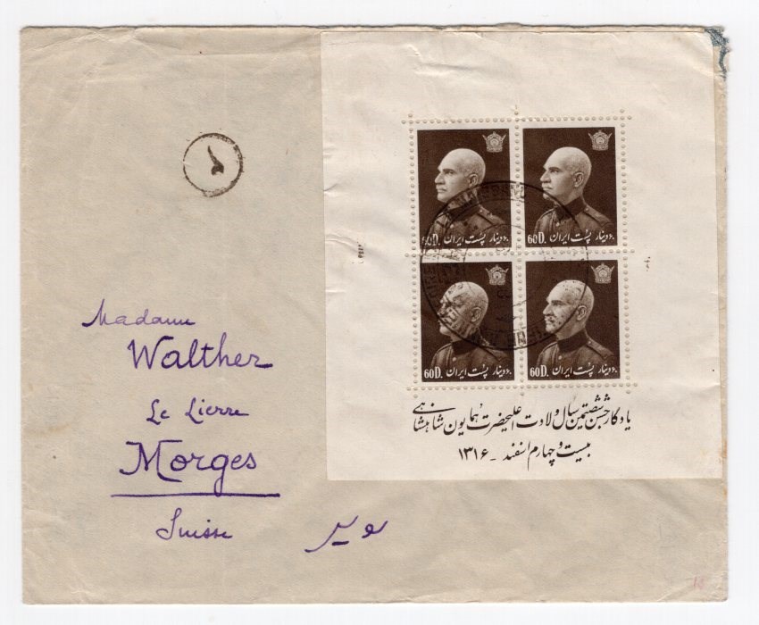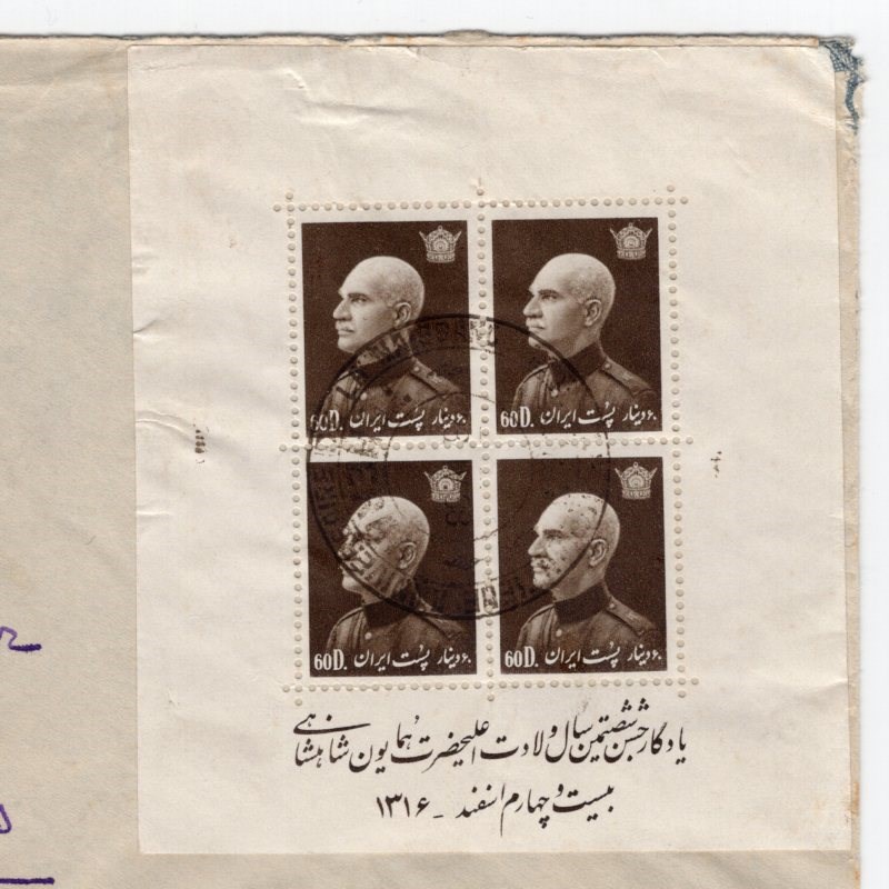 Sheet four 50 Dinar Reza Shah 60th birthday Scott # 870D on cover with fold on the side with birthday special postmark and circle with # 2?