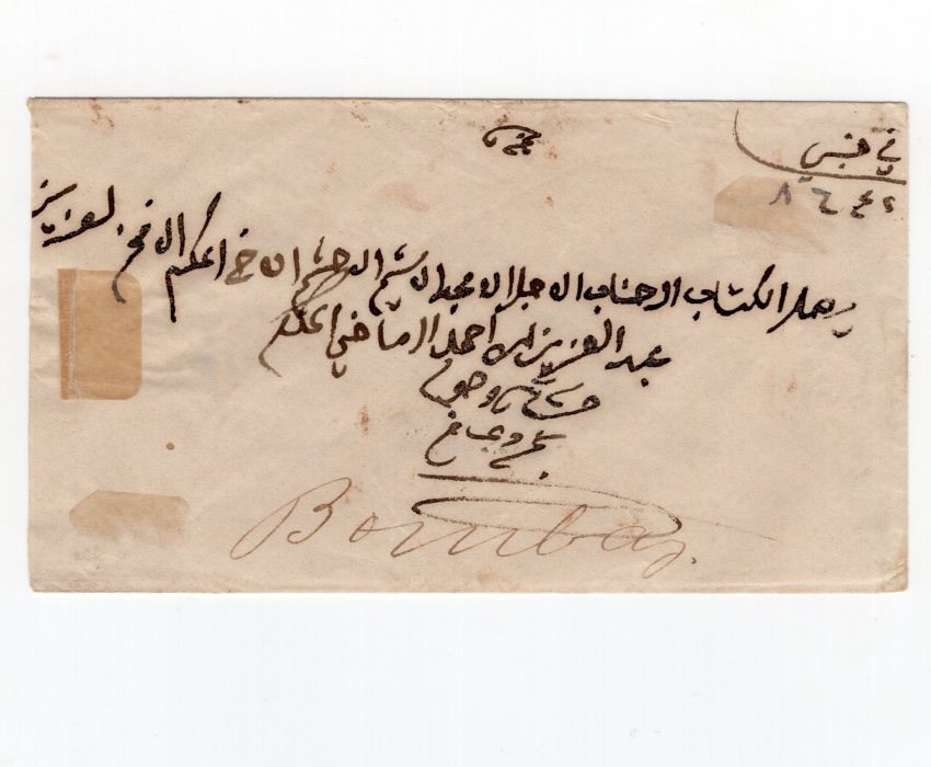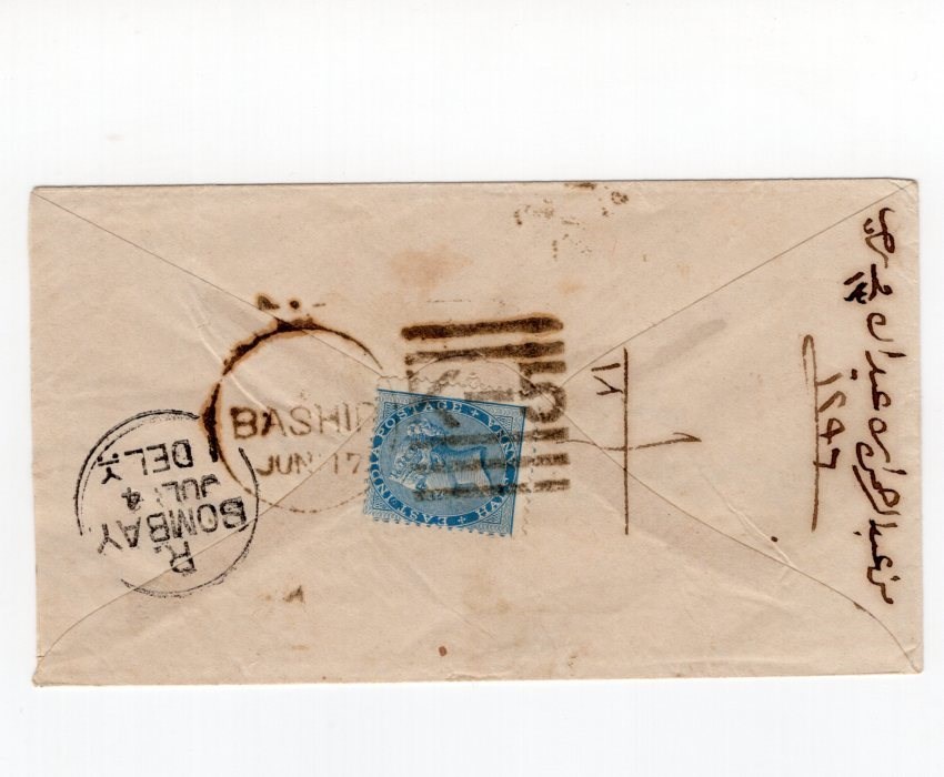 Half of Anna on cover from Bushire with Bashir K-5 postmark to Bombay, hinged remnant on front cover.